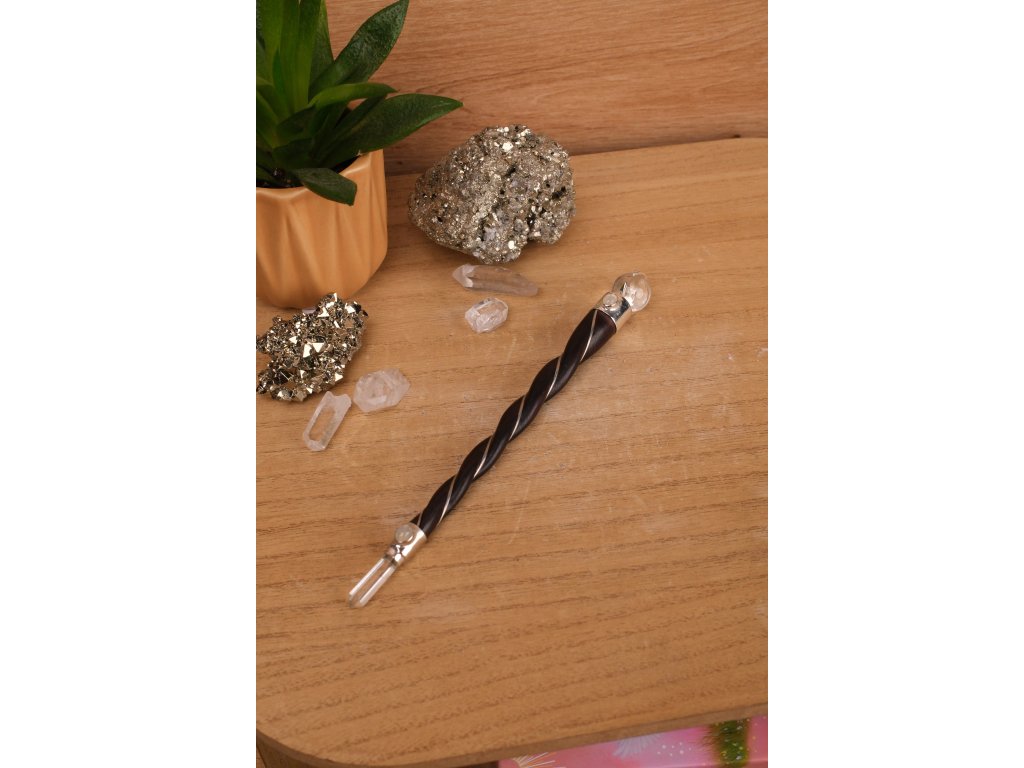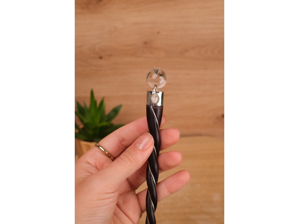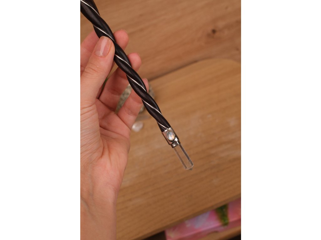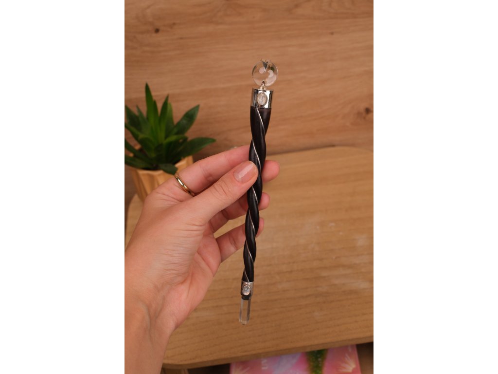 Ručně vyrobená minerální hůlka z palisandru (měsíční kámen, křišťálová špice, křišťálová kulička)