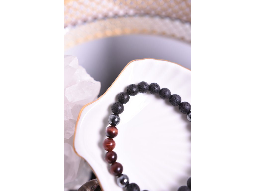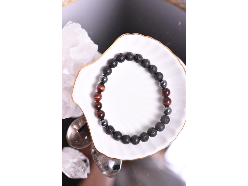 Lávový kámen, hematit a býčí oko pánský náramek 8mm (sebevědomí, cesta, síla)